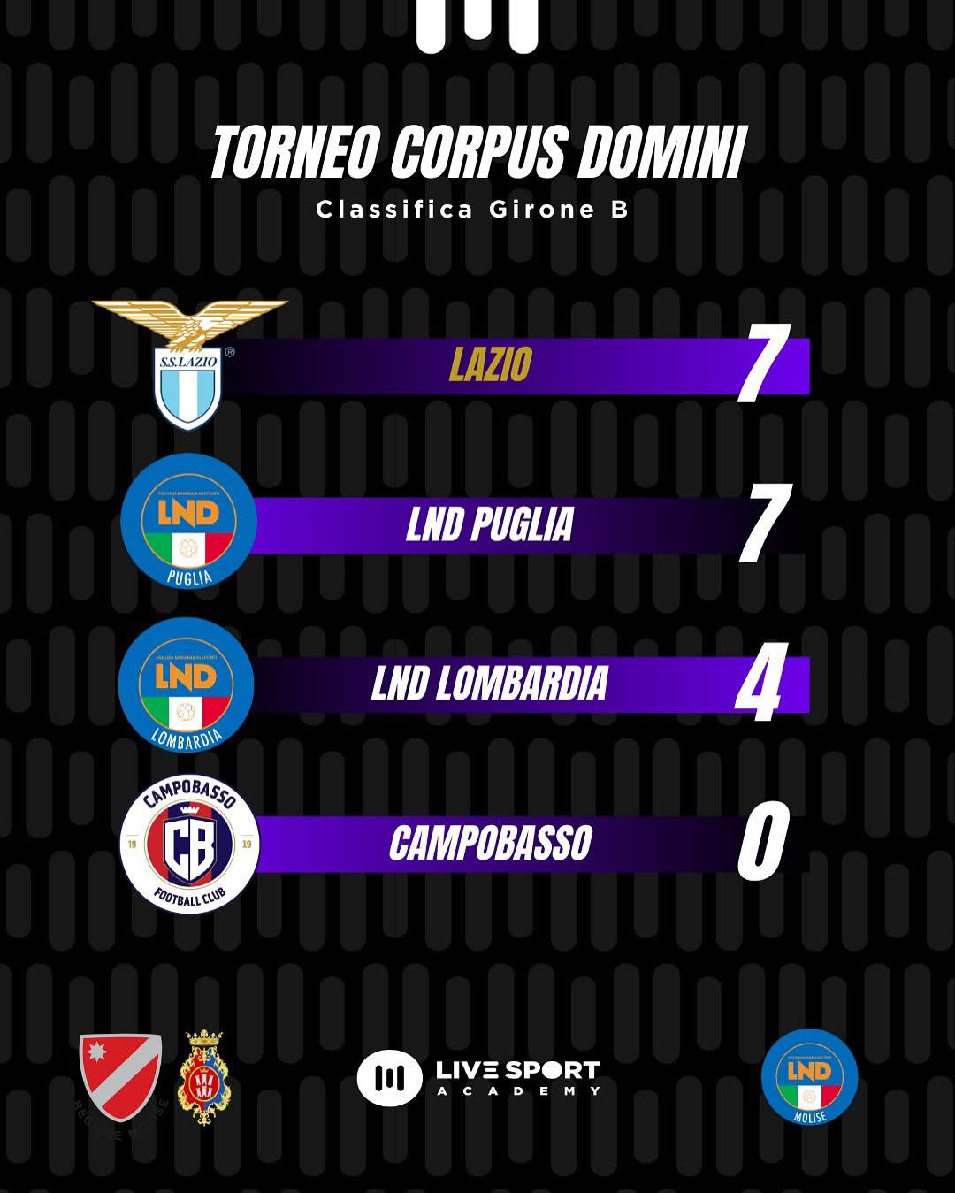 Si è conclusa con grande equilibrio la fase a gironi del Torneo di Corpus Domini. Il Bari conquista la finale grazie al primo posto nel Girone A con 6 punti. Nel Girone B, Lazio e Puglia guadagnano entrambe il primo posto a quota 7 punti, ma è la Lazio ad accedere alla finale grazie alla vittoria ai rigori nello scontro diretto del 19 giugno contro la selezione pugliese della LND.